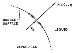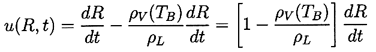 ......(2.1) But this is often a good approximation even when evaporation or condensation is occurring at the interface. To demonstrate this, consider a vapor bubble. The volume rate of production of vapor must be equal to the rate of increase of size of the bubble, 4πR2dR/dt, and therefore the mass rate of evaporation must be ρV(TB) 4πR2dR/dt where ρV(TB) is the saturated vapor density at the bubble temperature, TB. This, in turn, must equal the mass flow of liquid inward relative to the interface, and hence the inward velocity of liquid relative to the interface is given by ρV(TB)(dR/dt)/ρL. Therefore