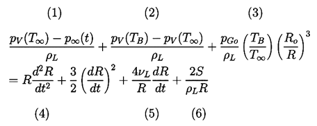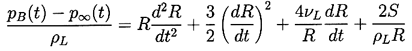 ......(2.9) Given p∞(t) this represents an equation that can be solved to find R(t) provided pB(t) is known. In the absence of the surface tension and viscous terms, it was first derived and used by Rayleigh (1917). Plesset (1949) first applied the equation to the problem of traveling cavitation bubbles.