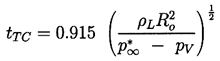 ......(2.39) The case of zero gas content presents a special albeit somewhat hypothetical problem, since apparently the bubble will reach zero size and at that time have an infinite inward velocity. In the absence of both surface tension and gas content, Rayleigh (1917) was able to integrate Equation 2.31 to obtain the time, tTC, required for total collapse from R=Ro to R=0: