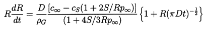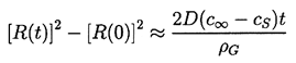 and therefore the concentration of gas at the liquid interface is cS=pGE/H. Epstein and Plesset (1950) found an approximate solution to the problem of a bubble in a liquid initially at uniform gas concentration, c∞, at time, t=0, which takes the form