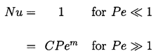 Another way in which the rate of heat transfer to the interface may be changed is by convection caused by relative motion between the bubble and the liquid. Such enhancement of the heat transfer rate is normally represented by a Nusselt number, Nu, defined as the ratio of the actual heat transfer rate divided by the rate of heat transfer by conduction. Therefore in the present context the factor, Nu, should be included as a multiplier in the thermal term of the Rayleigh-Plesset equation. Then one seeks a relationship between Nu and the Peclet number, Pe=WR/αL, where W is the typical translational velocity of the bubble relative to the liquid. The appropriate relationship for a growing and translating bubble is not known; analytically this represents a problem that is substantially more complex than that tackled by Plesset and Zwick. Nevertheless, it is of interest to speculate on the form of Nu(Pe) and observe the consequences for the bubble growth rate. Therefore let us assume that this relationship takes the approximate form common in many convective heat transfer problems: