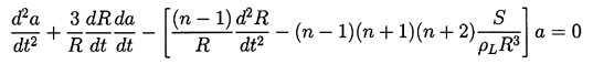 ......(2.71) The fact that the coefficients in Equation 2.71 are not constant in time causes departure from the equivalent Rayleigh-Taylor instability for a plane boundary. The coefficient of a is not greatly dissimilar from the case of the plane boundary in the sense that instability is promoted when d2R/dt2>0 and surface tension has a stabilizing effect. The primary difference is caused by the da/dt term, which can be interpreted as a geometric effect. As the bubble grows the wavelength on the surface increases, and hence the growth of the wave amplitude is lessened. The reverse occurs during collapse.