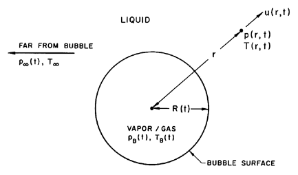 The radius of the bubble, R(t), will be one of the primary results of the analysis. As indicated in Figure 2.1, radial position within the liquid will be denoted by the distance, r, from the center of the bubble; the pressure, p(r,t) , radial outward velocity, u(r,t), and temperature, T(r,t), within the liquid will be so designated. Conservation of mass requires that