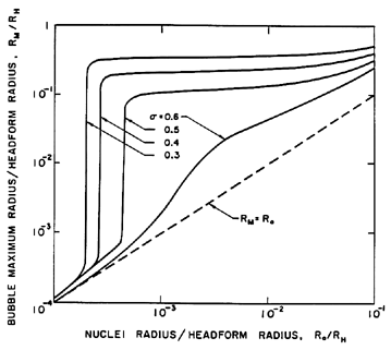 Figure 2.5 The maximum size, RM , to which a cavitation bubble grows according to the Rayleigh-Plesset equation as a function of the original nucleus size, Ro, and the cavitation number, σ, in the flow around an axisymmetric headform of radius, RH , with Weber number, ρLRHU∞2/S=28000 (from Ceccio and Brennen 1991). A quantitative example of this effect is shown in Figure 2.5, which presents results from the integration of the Rayleigh-Plesset equation for bubbles in the flow around an axisymmetric headform. It shows the maximum size which the bubbles achieve as a function of the size of the original nucleus for a typical Weber number, ρLRHU∞2/S, of 28000 where U∞ and RH are the free stream velocity and headform radius. Data are plotted for four different cavitation numbers, σ, representing different ambient pressure levels. Note that the curves for σ<0.5 all have abrupt vertical sections at certain critical nuclei sizes and that this critical size decreases with decreasing σ. Numerical results for this and other flows show that the critical size, RC, adheres fairly closely to the nondimensional version of the expression derived earlier,