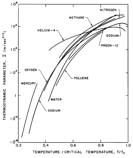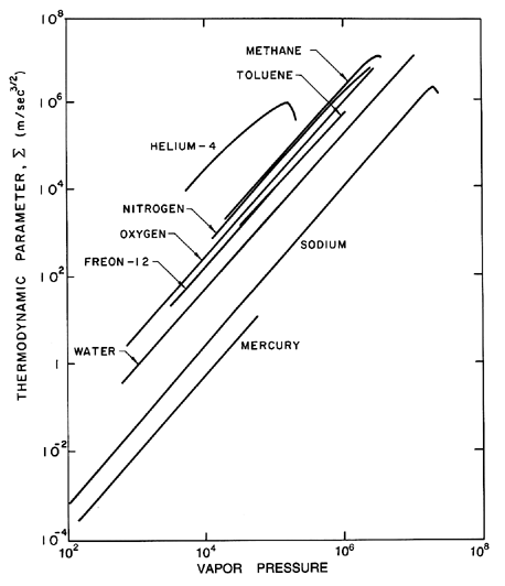 Figure 2.7 Values of the thermodynamic parameter, Σ, for various saturated liquids as a function of the vapor pressure (in kg/m s2). First examine the case of bubble growth. The asymptotic growth rate given by Equation 2.33 is constant and hence in the characteristic case of a constant p∞, terms (1), (3), (4), (5), and (6) in Equation 2.12 are all either constant or diminishing in magnitude as time progresses. Furthermore, a constant, asymptotic growth rate corresponds to the case