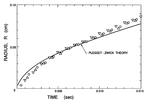 Figure 2.8 Experimental observations of the growth of three vapor bubbles (three different symbols) in superheated water at 103.1°C compared with the growth expected using the Plesset-Zwick theory (adapted from Dergarabedian 1953). When bubble growth is caused by decompression so that p∞(t) changes substantially with time during growth, the simple approximate solution of Equation 2.63 no longer holds and the analysis of the unsteady thermal boundary layer surrounding the bubble becomes considerably more complex. One must then solve the diffusion Equation 2.15, the energy equation (usually in the approximate form of Equation 2.17) and the Rayleigh-Plesset Equation 2.12 simultaneously, though for the thermally controlled growth being considered here, most of the terms in Equation 2.12 become negligible so that the simplification, pV(TB)=p∞(t), is usually justified. When p∞ is a constant this reduces to the problem treated by Plesset and Zwick (1952) and later addressed by Forster and Zuber (1954) and Scriven (1959). Several different approximate solutions to the general problem of thermally controlled bubble growth during liquid decompression have been put forward by Theofanous et al. (1969), Jones and Zuber (1978) and Cha and Henry (1981). Theofanous et al. include nonequilibrium thermodynamic effects on which we comment in the following section. If these are ignored, then all three analyses yield qualitatively similar results which also agree quite well with the experimental data of Hewitt and Parker (1968) for bubble growth in liquid nitrogen. Figure 2.9 presents a typical example of the data of Hewitt and Parker and a comparison with the three analytical treatments mentioned above.