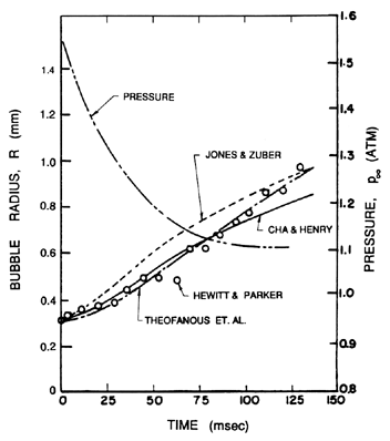 Figure 2.9 Data from Hewitt and Parker (1968) on the growth of a vapor bubble in liquid nitrogen (pressure/time history also shown) and comparison with the analytical treatments by Theofanous et al. (1969), Jones and Zuber (1978), and Cha and Henry (1981). Theofanous et al. (1969) explore the effects of small values of Λ theoretically. They confirm that values of order unity do not yield bubble histories that differ by very much from those that assume equilibrium. Values of Λ of the order of 0.01 did produce substantial differences. However, the results using equilibrium appear to compare favorably with the experimental results as shown in Figure 2.9. This suggests that nonequilibrium effects have little effect on thermally controlled bubble growth though the issue is not entirely settled since some studies do suggest that values of Λ as low as 0.01 may be possible.