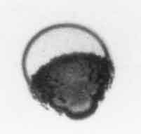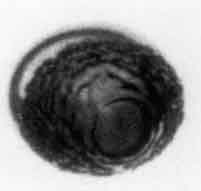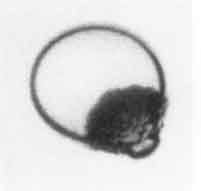 Figure 2.10 Typical photographs of a rapidly growing bubble in a droplet of superheated ether suspended in glycerine. The bubble is the dark, rough mass; the droplet is clear and transparent. The photographs, which are of different events, were taken 31, 44, and 58μs after nucleation and the droplets are approximately 2mm in diameter. Reproduced from Frost and Sturtevant (1986) with the permission of the authors.Shepherd and Sturtevant (1982) and Frost and Sturtevant (1986) have examined rapidly growing nucleation bubbles near the limit of superheat and have found growth rates substantially larger than expected when the bubble was in the thermally controlled growth phase. The experiments examined bubble growth within droplets of superheated liquid suspended in another immiscible liquid. Typical photographs are shown in Figure 2.10 and reveal that the surfaces of the bubbles are rough and irregular. The enhancement of the heat transfer caused by this roughening is probably responsible for the larger growth rates. Shepherd and Sturtevant (1982) attribute the roughness to the development of a baroclinic interfacial instability similar to the Landau-Darrieus instability of flame fronts. It is also of interest to note that Frost and Sturtevant report that the instability could be suppressed by increasing the ambient pressure and therefore the temperature and density within the bubble. At an ambient pressure of 2bar, the onset of the instability could be observed on the surface of ether bubbles and was accompanied by a jump in the radiated pressure associated with the sudden acceleration in the growth rate. At higher ambient pressures the instability could be completely suppressed. This occurs because the growth rate of the instability increases with the rate of growth of the bubble, and both are significantly reduced at the higher ambient pressures. It may be that, under other circumstances, the Rayleigh-Taylor instabilities described in Section 2.12 could give rise to a similar effect.