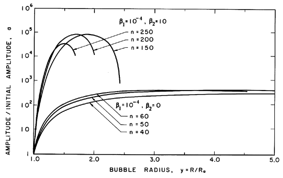 Figure 2.11 Examples of the growth of the amplitude, a, of a spherically harmonic disturbance (of order n as indicated) on the surface of a growing cavitation bubble for two typical choices of the surface tension and gas content parameters, β1 and β2. Some typical numerical integrations of Equation 2.72 in cases of bubble growth are shown in Figure 2.11 where the amplitude scale is arbitrary. Plesset and Mitchell performed hand calculations for small n and found only minor amplification during growth. However, as can be anticipated from Equation 2.72, the amplitudes may be much larger for large n. It can be seen from Figure 2.11 that the amplitude of the disturbance reaches a peak and then decays during growth. For given values of the parameters β1 and β2, there exists a particular spherical harmonic, n=nA, which achieves the maximum amplitude, a; in Figure 2.11 we chose to display data for n values which bracket nA. The dependence of nA on β1 and β2 is shown in Figure 2.12. A slightly different value of n denoted by nB gives the maximum value of a/y. Since the latter quantity rather than a represents a measure of the wave amplitude to wavelength ratio, Figure 2.12 also shows the dependence of nB on β1 and β2. To complete the picture, Figure 2.13 presents values of (a)max, (a/y)max and the sizes of the bubble (y)a=max and (y)a/y=max at which these maxima occur.