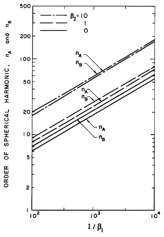 Figure 2.12 The orders of the spherical harmonic disturbances that, during bubble growth, produce (i) the maximum disturbance amplitude (nA) and (ii) the maximum ratio of disturbance amplitude to bubble radius (nB) for various surface tension and gas content parameters, β1 and β2.
