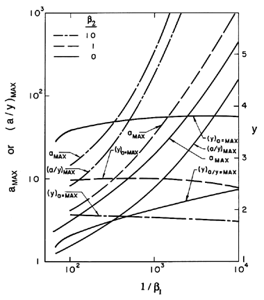 Figure 2.13 The maximum amplification, amax, and the maximum ratio of amplitude to bubble radius, (a/y)max, for spherical harmonic disturbances on the surface of a growing bubble for various surface tension and gas content parameters, β1 and β2. Also shown are the bubble sizes, (y)a=max and (y)a/y=max, at which these maxima occur. In summary, it can be seen that the initial acceleration phase of bubble growth in which d2R/dt2≥0 is unstable to spherical harmonic perturbations of fairly high order, n. On the other hand, visual inspection of Equation 2.71 is sufficient to conclude that the remainder of the growth phase during which dR/dt>0, d2R/dt2<0 is stable to all spherical harmonic perturbations. So, if inadequate time is available for growth of the perturbations during the acceleration phase, then the bubble will remain unperturbed throughout its growth. In their experiments on underwater explosions, Reynolds and Berthoud (1981) observed bubble surface instabilities during the acceleration phase that did correspond to fairly large n of the order of 10. They also evaluate the duration of the acceleration phase in their experiments and demonstrate, using an estimated growth rate, that this phase is long enough for significant roughening of the surface to occur. However, their bubbles become smooth again in the second, deceleration phase of growth. The bubbles examined by Reynolds and Berthoud were fairly large, 2.5cm to 4.5cm in radius. A similar acceleration phase instability has not, to the author's knowledge, been reported for the smaller bubbles typical of most cavitation experiments. This could either be the result of a briefer acceleration phase or the greater stabilizing effect of surface tension in smaller bubbles.