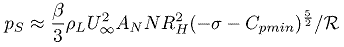 ......(3.19) where we have omitted some of the constants of order unity. For the relatively simple flows considered here, Equation 3.20 yields a sound pressure level that scales with U∞2 and with RH4 because AN is proportional to RH2. This scaling with velocity does correspond roughly to that which has been observed in some experiments on traveling bubble cavitation, for example, those of Blake, Wolpert, and Geib (1977) and Arakeri and Shangumanathan (1985). The former observe that ps is proportional to U∞m where m=1.5 to 2. There are, however, a number of complicating factors that can alter these scaling relationships. First, as we have discussed earlier in Section 2.5, only those nuclei larger than a certain critical size, Rc, will actually grow to become cavitation bubbles. Since Rc is a function of both σ and the velocity, U∞, this means that the effective N will be a function of Rc and U∞. Since Rc decreases as U∞ increases, this would tend to produce powers, m, somewhat greater than 2. But it is also the case that, in any experimental facility, N will typically change with U∞ in some facility-dependent manner. Often this will cause N to decrease with U∞ at constant σ (since N will typically decrease with increasing tunnel pressure), and this effect would then produce values of m that are less than 2.