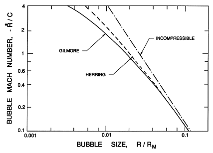 Early work on collapse focused on the inclusion of liquid compressibility in order to learn more about the production of shock waves. Herring (1941) introduced the first-order correction for liquid compressibility assuming the Mach number of collapse motion, |dR/dt|/c, was much less than unity and neglecting any noncondensable gas or thermal effects so that the pressure in the bubble remains constant. Later, Schneider (1949) treated the same, highly idealized problem by numerically solving the equations of compressible flow up to the point where the Mach number of collapse, |dR/dt|/c, was about 2.2. Gilmore (1952) (see also Trilling 1952) showed that one could use the approximation introduced by Kirkwood and Bethe (1942) to obtain analytic solutions that agreed with Schneider's numerical results up to that Mach number. Parenthetically we note that the Kirkwood-Bethe approximation assumes that wave propagation in the liquid occurs at sonic speed, c, relative to the liquid velocity, u, or, in other words, at c+u in the absolute frame (see also Flynn 1966). Figure 3.1 presents some of the results obtained by Herring (1941), Schneider (1949), and Gilmore (1952). It demonstrates how, in the idealized problem, the Mach number of the bubble surface increases as the bubble radius decreases. The line marked ``incompressible'' corresponds to the case in which the compressibility of the liquid has been neglected in the equation of motion (see Equation 2.36). The slope is roughly -3/2 since |dR/dt| is proportional to R-3/2. Note that compressibility tends to lessen the velocity of collapse. We note that Benjamin (1958) also investigated analytical solutions to this problem at higher Mach numbers for which the Kirkwood-Bethe approximation becomes quite inaccurate.
