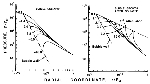 ......(3.1) However, as long as there is some gas present to decelerate the collapse, the primary importance of liquid compressibility is not the effect it has on the bubble dynamics (which is slight) but the role it plays in the formation of shock waves during the rebounding phase that follows collapse. Hickling and Plesset (1964) were the first to make use of numerical solutions of the compressible flow equations to explore the formation of pressure waves or shocks during the rebound phase. Figure 3.2 presents an example of their results for the pressure distributions in the liquid before (left) and after (right) the moment of minimum size. The graph on the right clearly shows the propagation of a pressure pulse or shock away from the bubble following the minimum size. As indicated in that figure, Hickling and Plesset concluded that the pressure pulse exhibits approximately geometric attentuation (like r-1) as it propagates away from the bubble. Other numerical calculations have since been carried out by Ivany and Hammitt (1965), Tomita and Shima (1977), and Fujikawa and Akamatsu (1980), among others. Ivany and Hammitt (1965) confirmed that neither surface tension nor viscosity play a significant role in the problem. Effects investigated by others will be discussed in the following section.