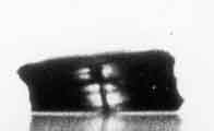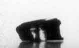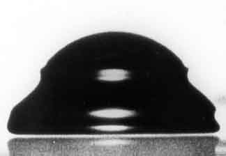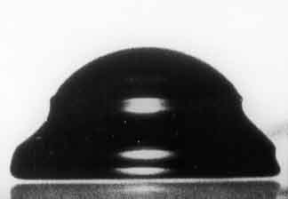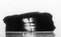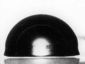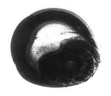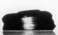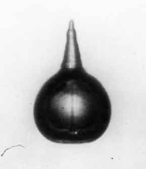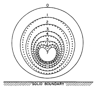 Figure 3.4 Photograph of a collapsing bubble showing the initial development of the reentrant microjet caused by a solid but transparent wall whose location is marked by the dotted line. From Benjamin and Ellis (1966) reproduced with permission of the first author.A dominant feature in the collapse of many vapor bubbles is the development of a reentrant jet (the n=2 mode) due to an asymmetry such as the presence of a nearby solid boundary. Such an asymmetry causes one side of the bubble to accelerate inward more rapidly than the opposite side and this results in the development of a high-speed re-entrant microjet which penetrates the bubble. Such microjets were first observed experimentally by Naude and Ellis (1961) and Benjamin and Ellis (1966). Of particular interest for cavitation damage is the fact that a nearby solid boundary will cause a microjet directed toward that boundary. Figure 3.4, from Benjamin and Ellis (1966), shows the initial formation of the microjet directed at a nearby wall. Other asymmetries, even gravity, can cause the formation of these reentrant microjets. Figure 3.5 is one of the very first, if not the first, photographs taken showing the result of a gravity-produced upward jet having progressed through the bubble and penetrated into the fluid on the other side thus creating the spiky protuberance. Indeed, the upward inclination of the wall-induced reentrant jet in Figure 3.4 is caused by gravity. Figure 3.6 presents a comparison between the reentrant jet development in a bubble collapsing near a solid wall as observed by Lauterborn and Bolle (1975) and as computed by Plesset and Chapman (1971).