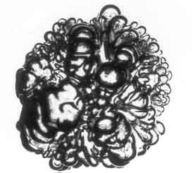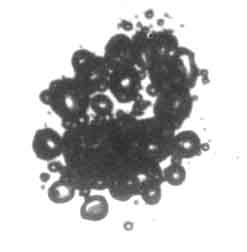 ......(3.8) On the the hand, it is clear from the theory that the bubble may become highly unstable to nonspherical disturbances during stage two because d2R/dt2 reaches very large positive values during this rebound phase. The instability appears to manifest itself in several different ways depending on the violence of the collapse and the presence of other boundaries. All vapor bubbles that collapse to a size orders of magnitude smaller than their maximum size inevitably emerge from that collapse as a cloud of smaller bubbles rather than a single vapor bubble. This fragmentation could be caused by a single microjet as described below, or it could be due to a spherical harmonic disturbance of higher order. The behavior of collapsing bubbles that are predominantly gas filled (or bubbles whose collapse is thermally inhibited) is less certain since the lower values of d2R/dt2 in those cases make the instability weaker and, in some cases, could imply spherical stability. Thus acoustically excited cavitation bubbles that contain substantial gas often remain spherical during their rebound phase. In other instances the instability is sufficient to cause fragmentation. Several examples of fragmented and highly distorted bubbles emerging from the rebound phase are shown in Figure 3.3. These are from the experiments of Frost and Sturtevant (1986), in which the thermal effects are substantial.