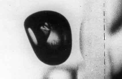 Figure 3.3 Photographs of an ether bubble in glycerine before (left) and after (center) a collapse and rebound. The cloud on the right is the result of a succession of collapse and rebound cycles. Reproduced from Frost and Sturtevant (1986) with the permission of the authors.