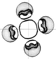 Figure 3.7 Numerical calculation of the collapse of a group of five bubbles showing the development of inward-directed reentrant jets on the outer four bubbles. From Chahine and Duraiswami (1992) reproduced with permission of the authors. Many other experimentalists have subsequently observed reentrant jets (or ``microjets'') in the collapse of cavitation bubbles near solid walls. The progress of events seems to differ somewhat depending on the initial distance of the bubble center from the wall. When the bubble is initially spherical but close to the wall, the typical development of the microjet is as illustrated in Figure 3.8, a series of photographs taken by Tomita and Shima (1990). When the bubble is further away from the wall, the later events are somewhat different; another set of photographs taken by Tomita and Shima (1990) is included as Figure 3.9 and shows the formation of two toroidal vortex bubbles (frame 11) after the microjet has completed its penetration of the original bubble. Furthermore, the photographs of Lauterborn and Bolle (1975) in which the bubbles are about a diameter from the wall, show that the initial collapse is quite spherical and that the reentrant jet penetrates the fluid between the bubble and the wall as the bubble is rebounding from the first collapse. At this stage the appearance is very similar to Figure 3.5 but with the protuberance directed at the wall.