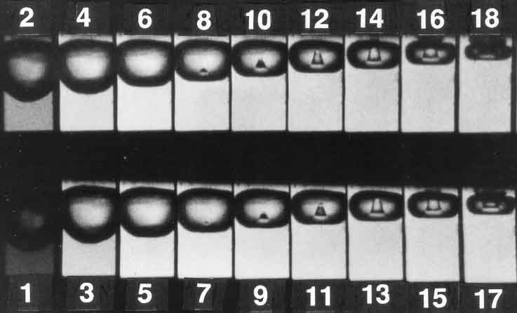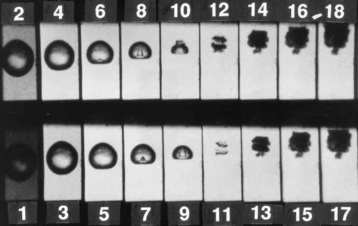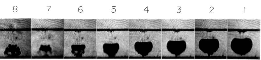 Figure 3.8 Series of photographs showing the development of the microjet in a bubble collapsing very close to a solid wall (at top of frame). The interval between the numbered frames is 2μs and the frame width is 1.4mm. From Tomita and Shima (1990), reproduced with permission of the authors.