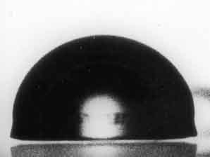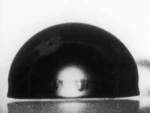 Figure 3.5 Photograph from Benjamin and Ellis (1966) showing the protuberence generated when a gravity-induced upward-directed reentrant jet progresses through the bubble and penetrates the fluid on the other side. Reproduced with permission of the first author.
