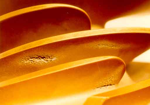 Figure 3.11 Photograph of typical cavitation damage on the blade of a mixed flow pump. Parenthetically it should be noted that pits caused by individual bubble collapses are often observed with soft materials, and the relative ease with which this process can be studied experimentally has led to a substantial body of research evidence for soft materials. Much of this literature implies that the microjets cause the individual pits. However, it does not neccessarily follow that the same mechanism causes the damage in harder materials.