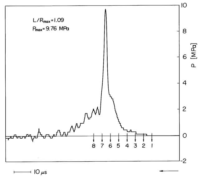 Indeed, the issue of whether cavitation damage is caused by microjets or by shock waves or by both has been debated for many years. In the 1940s and 1950s the focus was on the shock waves generated by spherical bubble collapse. When the phenomenon of the microjet was first observed by Naude and Ellis (1961) and Benjamin and Ellis (1966), the focus shifted to studies of the impulsive pressures generated by these jets. But, even after the disruption caused by the microjet, one is left with a remnant cloud of small bubbles that will continue to collapse collectively. Though no longer a single bubble, this remnant cloud will still exhibit the same qualitative dynamic behavior, including the possible production of a shock wave following the point of minimum cavity volume. Two important research efforts in Japan then shifted the focus back to the remnant cloud shock. First Shima et al. (1983) used high speed Schlieren photography to show that a spherical shock wave was indeed generated by the remnant cloud at the instance of minimum volume. Figure 3.12 shows a series of photographs of a collapsing bubble along with the corresponding pressure trace. The instant of minimum volume is between frames 6 and 7, and the trace clearly shows the peak pressure occuring at that instant. When combined with the Schlieren photographs showing a spherical shock being generated at this instant, this seemed to relegate the microjet to a subsidiary role. About the same time, Fujikawa and Akamatsu (1980) used a photoelastic material so that they could simultaneously observe the stresses in the solid and measure the acoustic pulses. Using the first collapse of a bubble as the trigger, Fujikawa and Akamatsu employed a variable time delay to take photographs of the stress state in the solid at various instants relative to the second collapse. They simultaneously recorded the pressure in the liquid and were able to confirm that the impulsive stresses in the material were initiated at the same moment as the acoustic pulse (to within about 1μs). They also conclude that this corresponded to the instant of minimum volume and that the waves were not produced by the microjet.