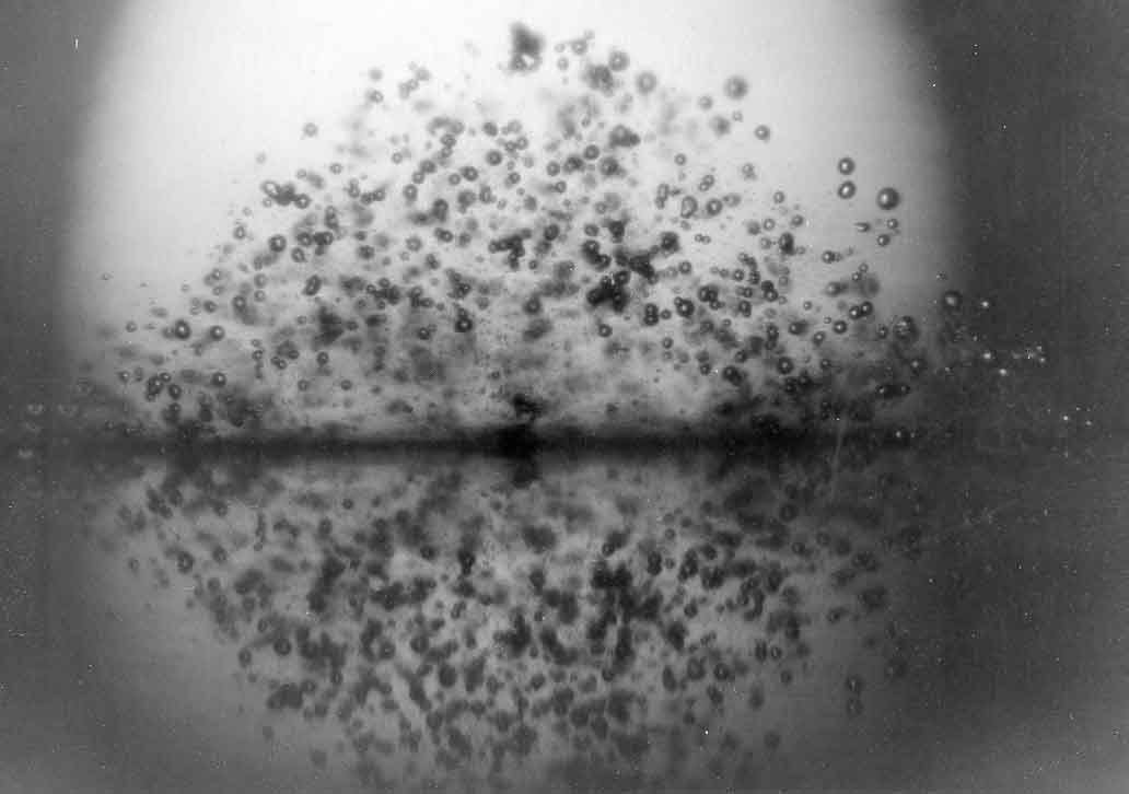 Figure 3.13 Photograph of a transient cloud of cavitation bubbles generated acoustically. From Plesset and Ellis (1955).In many practical devices cavitation damage is observed to occur in quite localized areas, for example, in a pump impeller. Often this is the result of the periodic and coherent collapse of a cloud of cavitation bubbles. Such is the case in the magnetostrictive cavitation testing equipment mentioned above. A typical cloud of bubbles generated by such acoustic means is shown in Figure 3.13. In other hydraulic machines, the periodicity may occur naturally as a result of regular shedding of cavitating vortices, or it may be a response to a periodic disturbance imposed on the flow. Example of the kinds of imposed fluctuations are the interaction between a row of rotor vanes and a row of stator vanes in a pump or turbine or the interaction between a ship's propeller and the nonuniform wake behind the ship. In almost all such cases the coherent collapse of the cloud can cause much more intense noise and more potential for damage than in a similar nonfluctuating flow. Consequently the damage is most severe on the solid surface close to the location of cloud collapse. An example of this phenomenon is included in Figure 3.14 taken from Soyama, Kato, and Oba (1992). In this instance clouds of cavitation are being shed from the leading edge of a centrifugal pump blade and are collapsing in a specific location, as suggested by the pattern of cavitation in the left-hand photograph. This leads to the localized damage shown in the right-hand photograph.