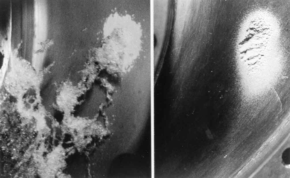 Figure 3.14 Axial views from the inlet of the cavitation and cavitation damage on the hub or base plate of a centrifugal pump impeller. The two photographs are of the same area, the one on the left showing the typical cavitation pattern during flow and the one on the right the typical cavitation damage. Parts of the blades can be seen in the upper left and lower right corners. Relative to these blades, the flow proceeds from the lower left to the upper right. The leading edge of the blade in upper left is just outside the field of view on the left. Reproduced from Soyama, Kato, and Oba (1992) with permission of the authors.At the time of writing, a number of research efforts are focusing on the dynamics of cavitation clouds. Later, in Section 6.10, we analyze some of the basic dynamics of spherical bubble clouds and show that the interaction between bubbles lead to a coherent dynamics of the cloud, including natural frequencies that can be much smaller than the natural frequencies of individual bubbles. These studies suggest that the coherent collapse can be more violent than that of individual bubbles. However, a complete explanation for the increase in the noise and damage potential does not yet exist.