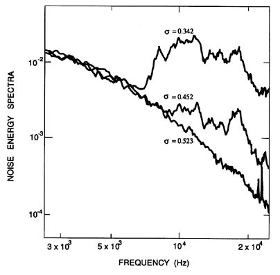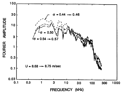 The noise due to cavitation in the orifice of a hydraulic control valve is typical, and spectra from such an experiment are presented in Figure 3.15. The lowest curve at σ=0.523 represents the turbulent noise from the noncavitating flow. Below the incipient cavitation number (about 0.523 in this case) there is a dramatic increase in the noise level at frequencies of about 5kHz and above. The spectral peak between 5kHz and 10kHz corresponds closely to the expected natural frequencies of the nuclei present in the flow (see Section 4.2).