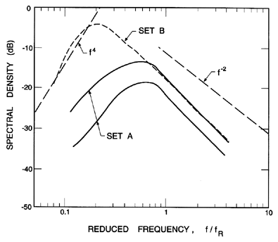 Figure 3.16 Acoustic power spectra of the noise from a cavitating jet. Shown are mean lines through two sets of data constructed by Blake and Sevik (1982) from the data by Jorgensen (1961). Typical asymptotic behaviors are also indicated. The reference frequency, fR, is (p∞/ρLD2)½ where D is the jet diameter. The peaks in many of the spectra of the noise from cavitating flows (for example those of Figures 3.15 and 3.16) tend to lower frequencies as the cavitation number decreases, primarily because of an increase in the amplitude of the higher frequencies. This trend is further illustrated by the data for cavitating jets presented in Figure 3.17. Given some form for the asymptotes at high and low frequency and some functional behavior for the location of the peak frequency, it is not unreasonable to seek to reduce the measured spectra for a given type of cavitating flow to some universal form. Arakeri and Shangumanathan (1985) were able to reduce the noise spectra from cavitating headform experiments to a single band provided the bubble population was low enough to eliminate bubble/bubble interaction. Blake (1986a) has attempted a similar task for the various kinds of cavitation that can occur on a propeller, since the ability to scale from model tests to the prototype is important in that context. There remain, however, a number of unresolved issues that seem to demand a closer examination of the basic mechanics of noise production even in the absence of bubble/bubble interactions.