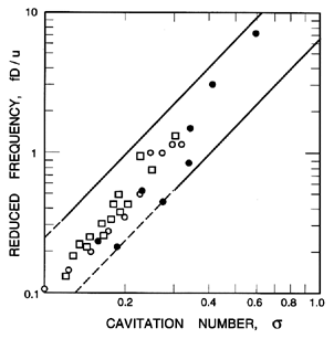 Figure 3.17 Frequency of the peak in the acoustic spectra as a function of cavitation number. Data for cavitating jets from Franklin and McMillan (1984). The jet diameter and mean velocity are denoted by D and u. Recently Ceccio and Brennen (1991) have recorded the noise from individual cavitation bubbles in a flow; a typical acoustic signal from their experiments is reproduced in Figure 3.18. The large positive pulse at about 450μs corresponds to the first collapse of the bubble. This first pulse in Figure 3.18 is followed by some facility-dependent oscillations and by a second pulse at about 1100μs . This corresponds to the second collapse, which follows the rebound from the first collapse. Further rebounds are possible but were not observed in these experiments.