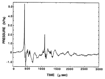 Figure 3.12 Series of photographs of a cavitation bubble collapsing near a wall along with the characteristic wall pressure trace. The time corresponding to each photograph is marked by a number on the trace. From Shima, Takayama, Tomita, and Ohsawa (1983) reproduced with permission of the authors. However, in a later investigation, Kimoto (1987) was able to observe stress pulses that resulted both from microjet impingement and from the remnant cloud collapse shock. Typically, the impulsive pressures from the latter are 2 to 3 times larger than those due to the microjet, but it would seem that both may contribute to the impulsive loading of the surface.