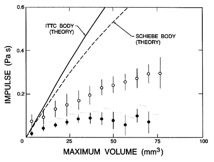 Figure 3.19 Comparison of the acoustic impulse, I, produced by the collapse of a single cavitation bubble on two axisymmetric headforms as a function of the maximum volume prior to collapse. Open symbols: average data for Schiebe headform; closed symbols: ITTC headform; vertical lines indicate one standard deviation. Also shown are the corresponding results from the solution of the Rayleigh-Plesset equation. From Ceccio and Brennen (1991).A good measure of the magnitude of the collapse pulse is the acoustic impulse, I, defined as the area under the pulse or