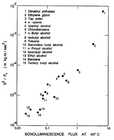 As one would expect from the Rayleigh-Plesset equation, the surface tension and vapor pressure of the liquid are important in determining the sonoluminescence flux as the data of Jarman (1959) clearly show (see Figure 3.21). Certain aqueous solutes like sodium disulphide seem to enhance the luminescence, though it is not clear that the same mechanism is responsible for the light emission under these circumstances. Sonoluminescence is also strongly dependent on the thermal conductivity of the gas (Hickling 1963, Young 1976), and this is particularly evident with gases like xenon and krypton, which have low thermal conductivities. Clearly then, the conduction of heat in the gas plays an important role in the phenomenon. Therefore, the breakup of the bubble prior to complete collapse might be expected to eliminate the phenomenon completely.