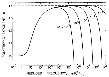 Figure 4.3 Effective polytropic exponent, k, for a diatomic gas (γ=1.4) as a function of a reduced frequency, ωRE2/αG, for various values of a reduced thermal diffusivity of the gas, αG* (see text). Adapted from Prosperetti (1977b).