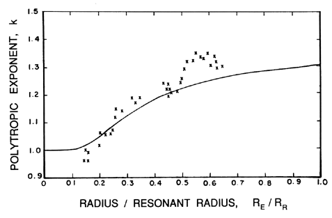 Figure 4.4 Experimentally measured polytropic exponents, k, for air bubbles in water as a function of the bubble radius to resonant bubble radius ratio. The solid line is the theoretical result. Adapted from Crum (1983).Prosperetti, Crum, and Commander (1988) summarize the current understanding of the theory in which