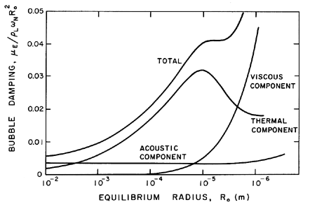 The relative magnitudes of the three components of damping (or ``effective" viscosity) can be quite different for different bubble sizes or radii, RE. This is illustrated by the data for air bubbles in water at 20°C and atmospheric pressure that is taken from Chapman and Plesset (1971) and reproduced as Figure 4.5. Note that the viscous component dominates for very small bubbles, the thermal component is dominant for most bubbles of practical interest, and the acoustic component only dominates for bubbles larger than about 1cm.