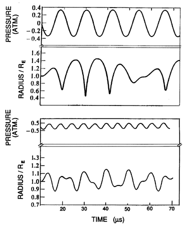 Though we imply that these three situations follow with increasing amplitude, it is important to note that other factors are important in determining the kind of response that will occur for a given oscillating pressure field. One of the factors is the relationship between the frequency, ω, of the imposed oscillations and the natural frequency, ωN, of the bubble. Sometimes this is characterized by the relationship between the equilibrium radius of the bubble, RE, in the absence of pressure oscillations and the size of the hypothetical bubble, RR, which would resonate at the imposed frequency, ω. Another important factor in determining whether the response is stable or transient is the relationship between the pressure oscillation amplitude,