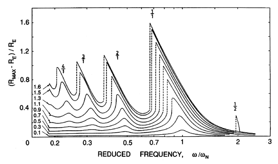 Weakly nonlinear solutions can also be used to construct frequency response spectra similar to those due to Lauterborn (1976) described in the preceding section. Figure 4.10 includes examples of such frequency response spectra obtained by plotting the maximum possible deviation from the equilibrium radius, (Rmax-RE)/RE, against the excitation frequency. For convenience we estimate (Rmax-RE)/RE as