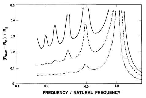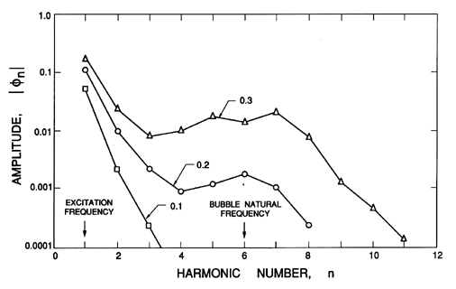 Clearly the weakly nonlinear solutions exhibit subharmonic resonances similar to those seen in the more exact solutions like those of Lauterborn (1976). However, they lack some of the finer detail such as the skewing of the resonant peaks that produces the sudden jumps in the response at some subresonant frequencies.