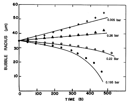 Figure 4.11 Examples from Crum (1980) of the growth (or shrinkage) of air bubbles in saturated water (S=68dynes/cm) due to rectified diffusion. Data is shown for four pressure amplitudes as shown. The lines are the corresponding theoretical predictions.