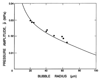 Figure 4.12 Data from Crum (1984) of the threshold pressure amplitude for rectified diffusion for bubbles in distilled water (S=68dynes/cm) saturated with air. The frequency of the sound is 22.1kHz. The line is the prediction of Equation 4.35. Finally, we note again that most of the theories assume spherical symmetry and that departure from sphericity could alter the diffusion boundary layer in ways that could radically affect the mass transfer process. Furthermore, there is some evidence that acoustic streaming induced by the excitation can also cause disruption of the diffusion boundary layer (Elder 1959, Gould 1966).