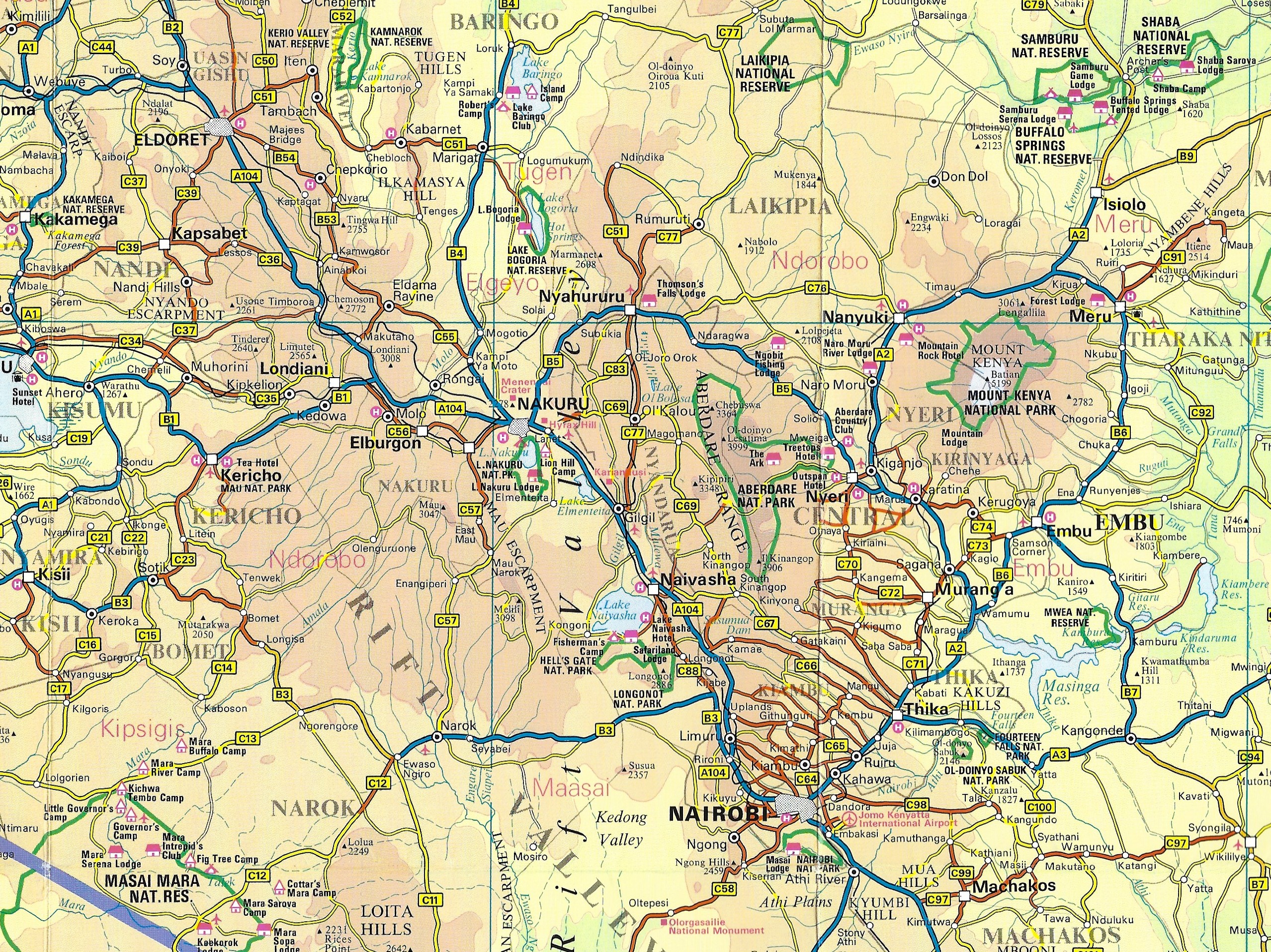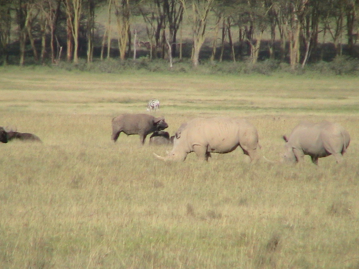 We drove along the Aberdare range to Thompsons Falls at Nyahururu for a short break. Then on down the Great Rift Valley to Lake Nakuru Lodge for lunch inside the Lake Nakuru National Park. Created as a bird sanctuary, Lake Nakuru National Park features more than 400 species of birds, many from Europe and East Asia. The park includes a large savanna area to the south. A shallow blue-green alkaline lake famous for its flocks of pink lesser and greater flamingoes. The tilapia grahami fish were introduced to provide food for the pelicans who also call Lake Nakuru home. The blue-green color is because of the presence of blue-green algae called spirulinga. The level of the lake goes up and down with the amount of rainfall and the color is dependent on the conditions for the growth of algae. There have been up to two million flamingoes on the lake at one time. When disturbed the birds lift gracefully into the air in a solid moving pink carpet. Nakuru is also excellent for viewing the Rothschild giraffe, the black rhino as well as hippo, reedbuck and defassa waterbuck. We stayed overnight at Sarova Lion Hill Lodge (0.31682oS 37.1523oE).