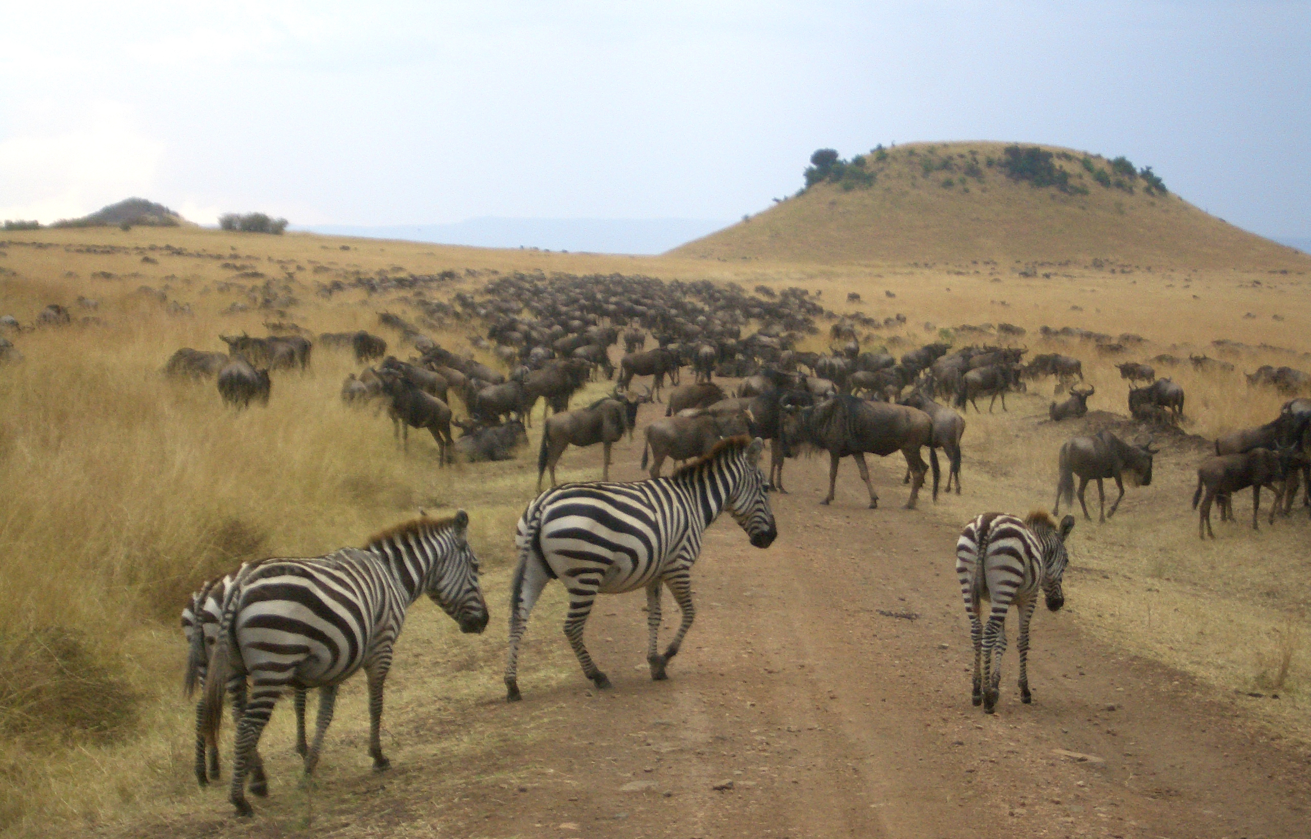 The following day we enjoyed game viewing in the vast Masai Mara National Reserve. The Masai Mara is the most popular game reserve in Kenya. It is an extension of the Serengeti plain in Tanzania, and offers the best game viewing in Kenya. On the wide open rolling grasslands you can see an incredible variety of different animals at one time. Perhaps a cheetah mother sits on a termite mound with her punky-looking cubs, while beyond, gazelle, antelope and zebra placidly graze. Giraffe might peer curiously through the trees, while elephants pass on silent feet and vultures circle above. Every year millions of wildebeest migrate north from the Serengeti to the green grass of the Mara. This exciting spectacle usually occurs sometime between July and August. Even when animals are not highlighting the scene, the views by themselves are worth the trip.