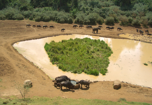 Game most frequently seen include: buffalo, elephant, rhino, forest hogs, suni, red duiker, spotted hyena, genet cat, and if you are lucky, a leopard or the big male lion who makes his appearance every now and then. Since the lodge was deliberately located beside a route animals travel between Mt. Kenya and the lowlands, it is not uncommon to see very large herds of animals. At night the waterhole area is lit by floodlights.